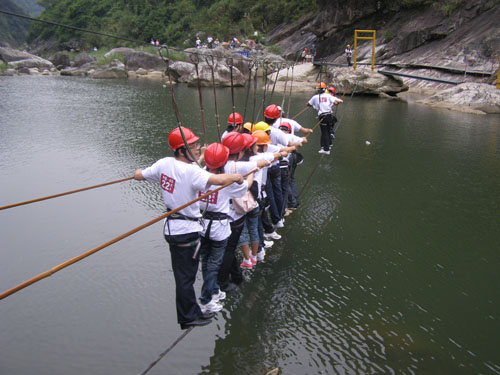 中午12点多集体用餐后,大家顾不上休息,便进入了第二站九鲤溪拓展乐园。该乐园景区是利用天然美丽的峡谷依势而建,在领略高山流水,享受清新空气的同时,进行趣味性运动。大家来到乐园门口集合时,教官便给每个人配备一套安全装备(包括安全绳、安全帽)。在经历了过缅甸桥、携手并进、抽板过河、飞檐走壁、荡绳过河、凌空漫步、勇往直前、高空溜索、过浮桩桥、飞夺泸定桥等惊险运动项目后,大家精神十足,意犹未尽。全程约三个小时,每个项目都具有其惊险特色,每过一关难度都有所加大。有的项目需要有个人斗智斗勇,有的则需要有团队协同作战,不仅是挖掘个人潜力和增强团队合作能力,激发其内在战胜自我的欲望,而且是增强战胜困难的信心和完善其性格及其处事的能力。