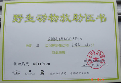 晚上七点多,市、县有关单位及温州商报人员驱车赶来,经鉴定是野生动物毛冠鹿,属省级一级保护动物,由于伤势很重,须将这只小动物接走,准备送去救治。随后数日给公司颁发了野生动物救助证书。
