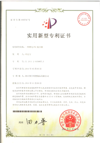 为了更好地为经营创造条件,全面提升公司品牌影响力和市场竞争力。通过多年的努力,2011年翔宇公司先后荣获“浙江省成长型中小企业”的称号;公司生产《静电膜》产品获得国家专利局专利产权认证;通过苍南县科技局专家评审翔宇公司被认定为科技型企业。