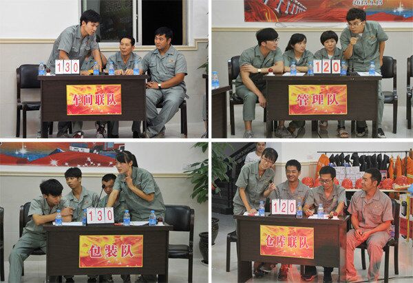 6时40分,竞赛答题开始。今晚的竞赛队,分别是管理队、包装队、车间联队、仓库联队,参赛队的基础分为100分。首轮竞赛为个人必答题、按规定号码依次抽签题题目后,由每号台领队作必答题首答。在各自“粉丝”的呐喊声中,首轮必答题的成绩,除管理队负10分外,其他队平分秋色。第二轮由各号台任意选一位答题,进行了2个轮回,各队轮番答题,比分交错上升,二个轮次结束,包装、车间联队都以140分暂时领先,管理、仓库联队各以130暂居后。第三轮次抢答题开始,各队之间呈现了你追我赶,我上你下,争分夺秒竞争激烈的局面,有抢时违规被倒扣分、有答题出错扣分、有抢不到答题机会处于被动的。此番遭遇战后,管理队反败为胜以150分领先,车间队以140分紧追其后,包装队和仓库联队因抢答违规,总分分别以130分、120分居后。最后一轮的风险题进行2个轮次,并由20分题、30分题、50分题供各号台选择,经过一番激烈争夺管理队以总分220分争得了团队第一名;仓库联队奋起直追,以总成绩200分居第二名;总分并列的仓库联队、包装队进行了现场抢答加时赛,最终因包装队抢题违规而屈居团队第三名。观众互动题环节,台上主持人问题未宣布完毕,台下观众早已迫不及待举手示意答题,气氛热烈,一浪高一浪。不一会,20份奖品被答题的正确台下观众领取一空……