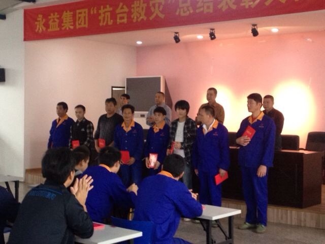 11月4日上午,永益集团组织全体干部员工,召开了抗击23号台风"菲特"工作总结表彰大会。会上对车间生产一线的2个先进集体和28位先进个人颁发了锦旗、证书和奖金。并对9名管理人员和后勤人员进行了通报表杨。