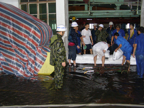 灾情就是命令。为了减少灾害损失,董事长张仁良、总经理林定淦和副总经理张光科、张勇一起亲临一线,组织抢险,指挥抗台。共发动员工40余人,调用铲车3台、抽水泵2台,分成若干小组,有的架泵抽水,有的搬砂袋堵门挡水,有的抢运被淹材料和成品,有的拆卸电器设备,从领导到员工个个都是顶风冒雨,争分夺秒,外面淋湿了,里面汗透了,大家发扬连续作战的精神,不叫苦,不叫累,经过大半天的奋力抢险,几十万元的财产得到安全转移,积水得到了明显的控制,大家才缓了一口气。